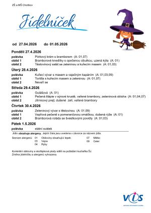 Jídelní lístek ZŠ a MŠ Chotíkov na týden 27. 04. 2026 - 01. 05. 2026.