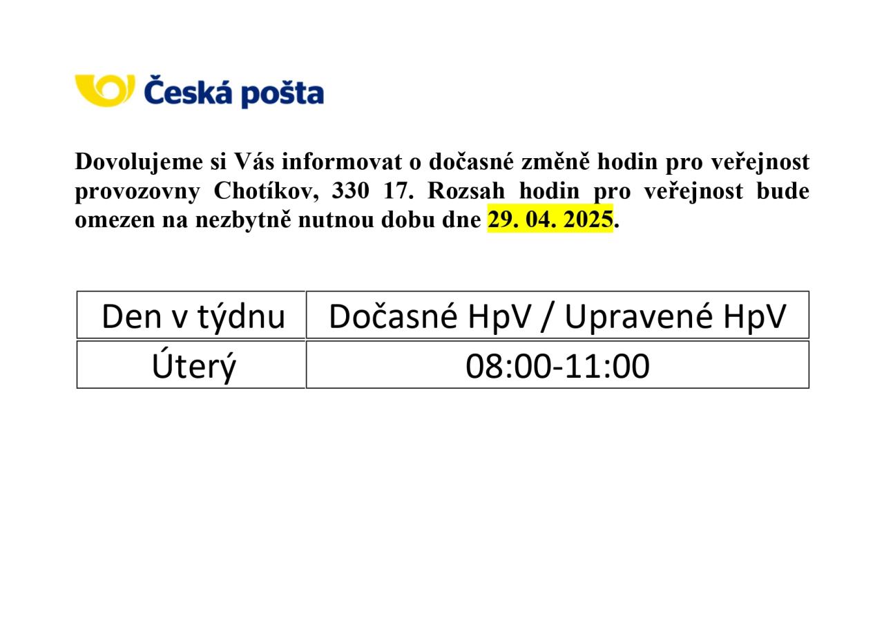 Česká pošta - změna provozní doby dne 29.04.2025 z provozních důvodů.