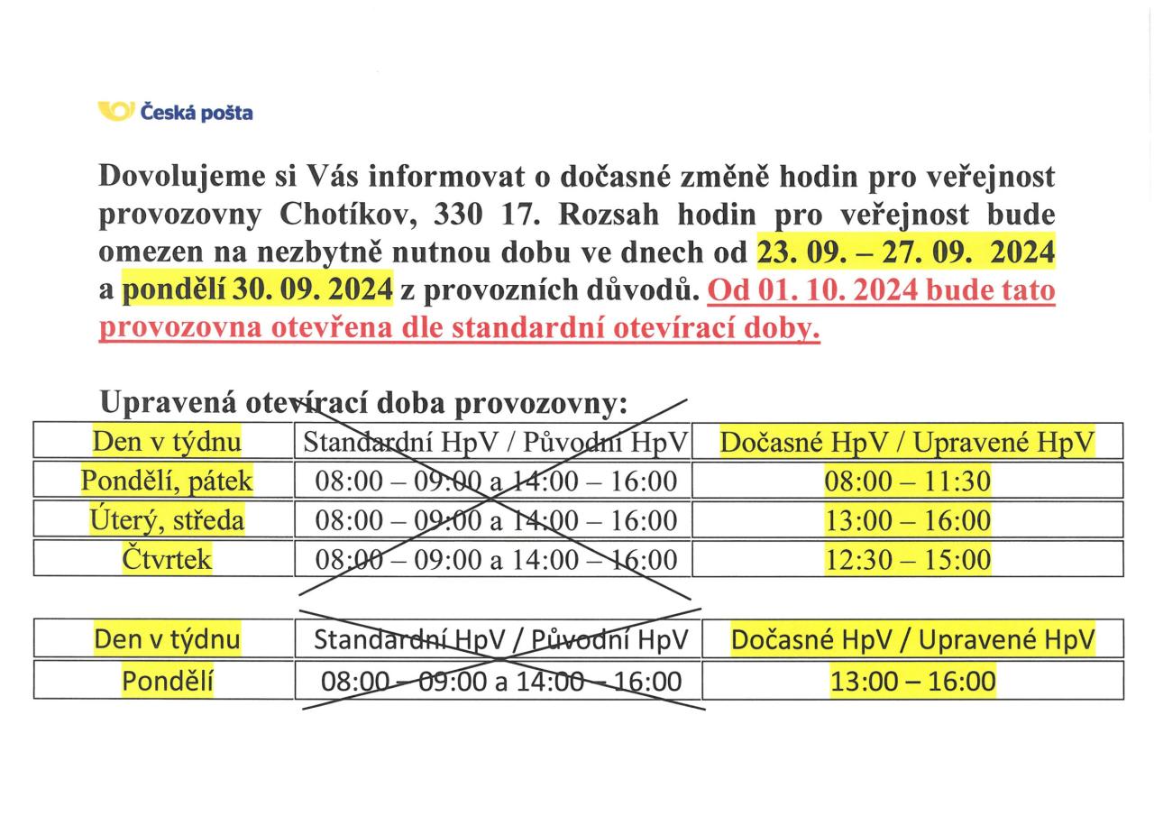 Česká pošta - změna provozní doby ve dnech od 23.09. - 27.09.2024 a 30.09.2024 1