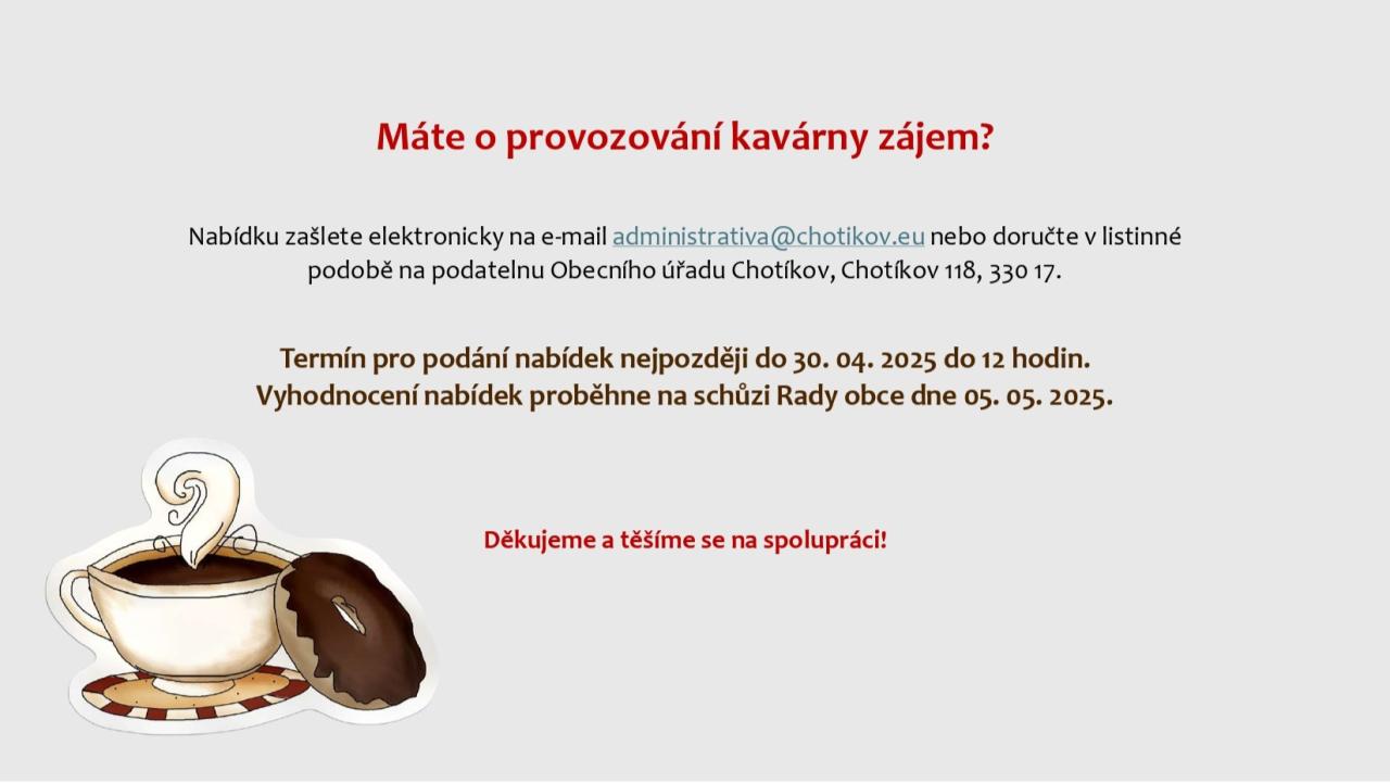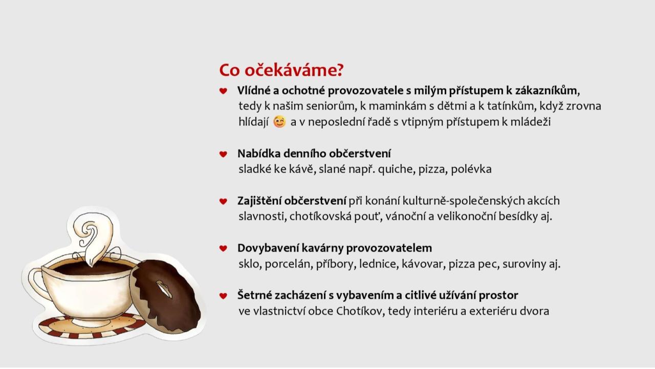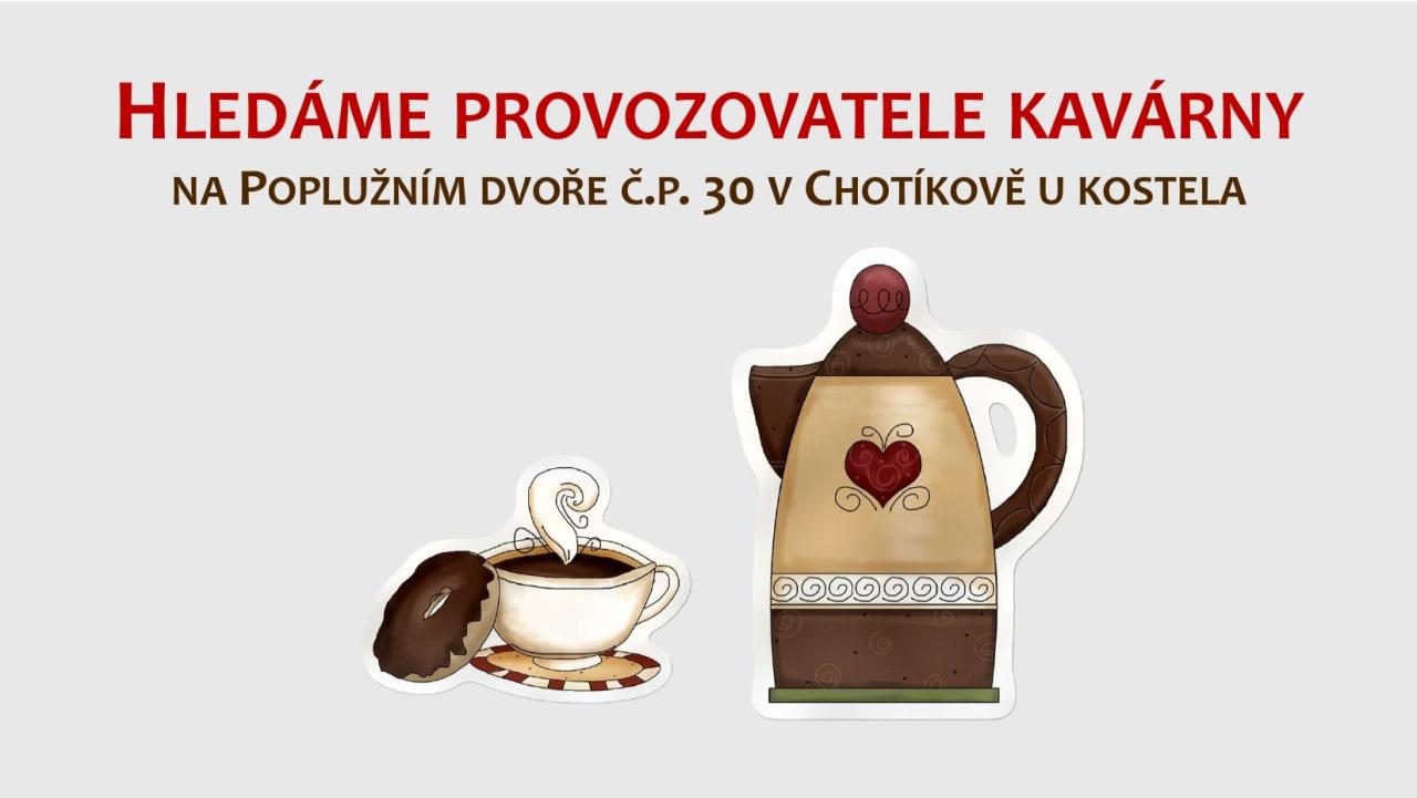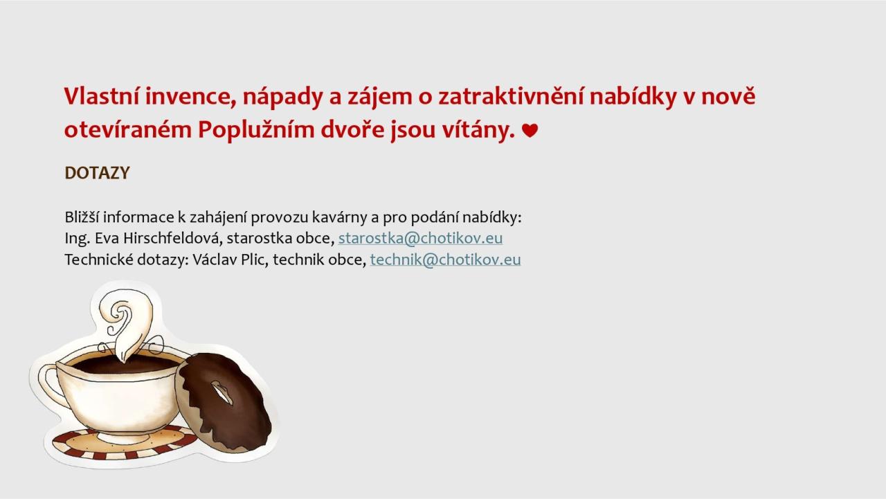 vedení obce Chotíkov zveřejnilo na úřední desce obce záměr pronájmu přízemí domku na Poplužním dvoře č. p. 30. Hledáme spolehlivého provozovatele kavárny s občerstvením.