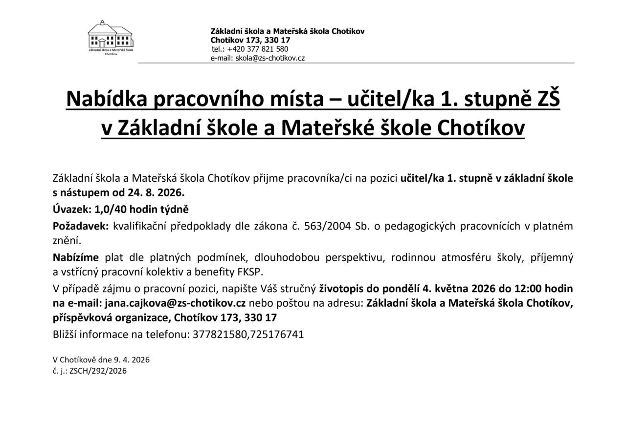 Základní škola a Mateřská škola Chotíkov přijme od 24. 8. 2026 pracovníka/ci na pozici učitel/ka 1. stupně v základní škole. V případě zájmu o pracovní pozici napište Váš životopis do 04. 05. 2026 do 12:00 hodin na e-mail: jana.cajkova@zs-chotikov.cz