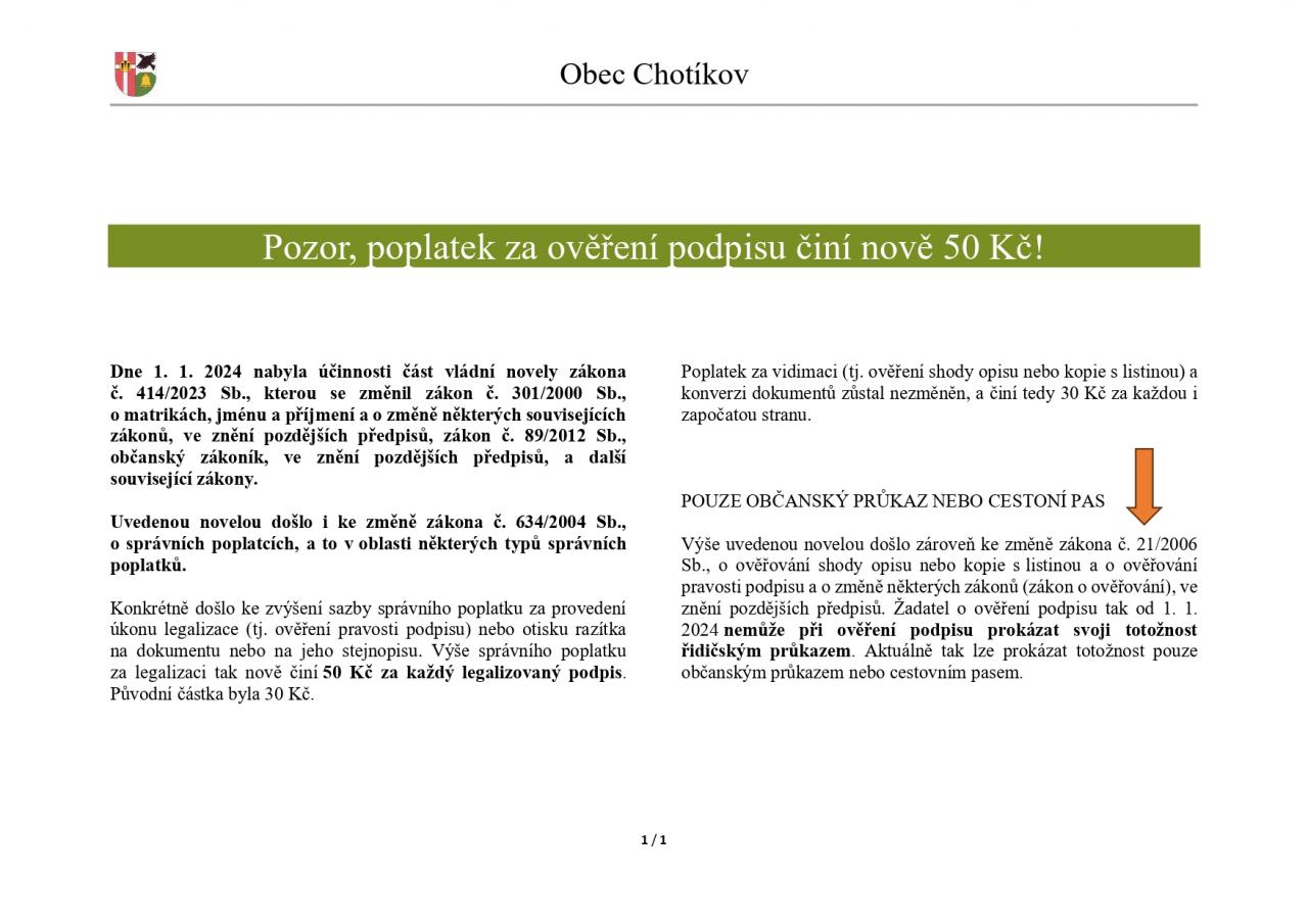 Nová sazba poplatku od 01. 01. 2024 za legalizaci podpisu činí 50,- Kč.
