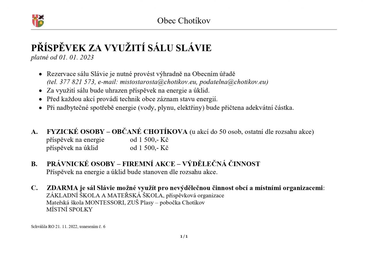 z důvodu velkého nárůstu cen energií bude za využití obecního kulturního sálu Slávie, Chotíkov čp. 300 účtován od 01 .01. 2023 za využití sálu příspěvek na energie a úklid.