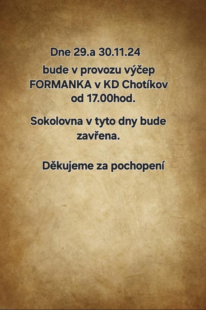 Ve dnech 29. a 30. 11. 2024 bude hostinec na hřišti uzavřen a v provozu bude výčep v kulturním zařízení Slávie.