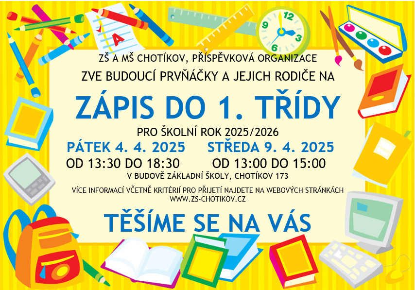 Zápis dětí do 1. třídy se uskuteční ve dnech 04. 04. a 09. 04. 2025 v budově základní školy, Chotíkov 173.