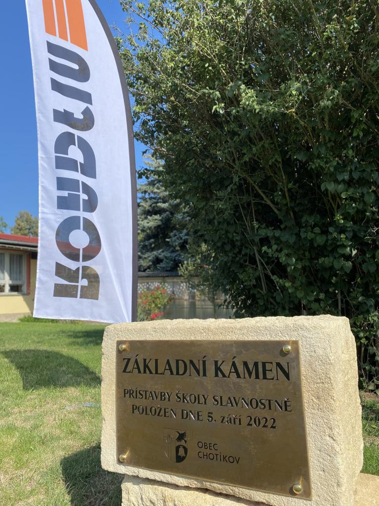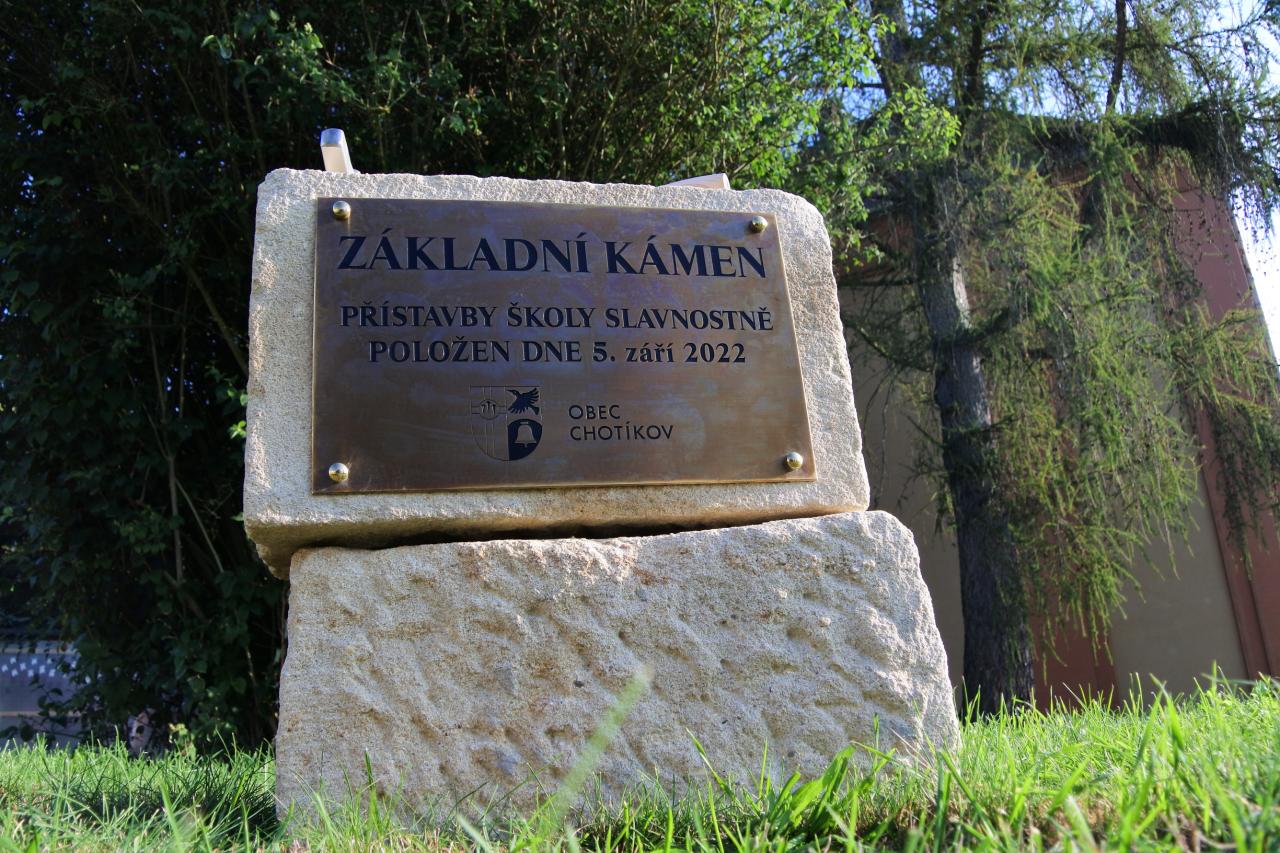 Slavnostní položení základního kamene přístavby hlavní budovy školy v Chotíkově proběhlo dne 5. září 2022 za účasti starostky obce Evy Hirschfeldové, architekta Jiřího Opla, jednatele za zhotovitele Václava Kotěšovce, pedagogického sboru a v neposlední řadě našich milých žáků. Počasí nám přálo.