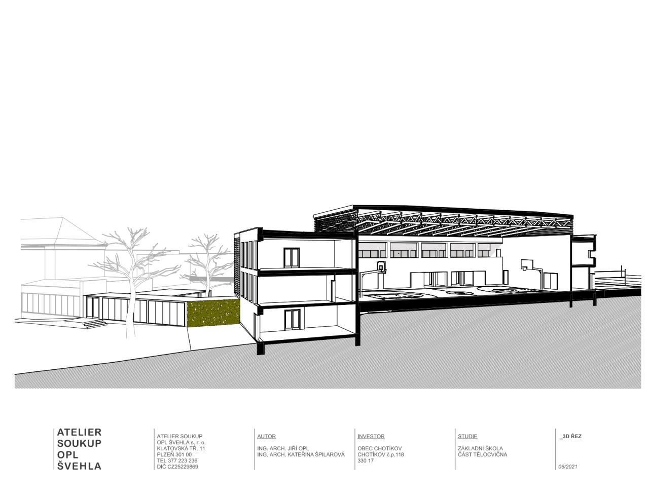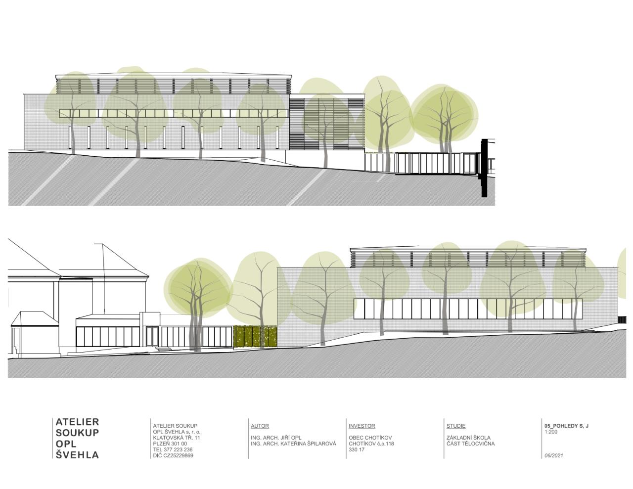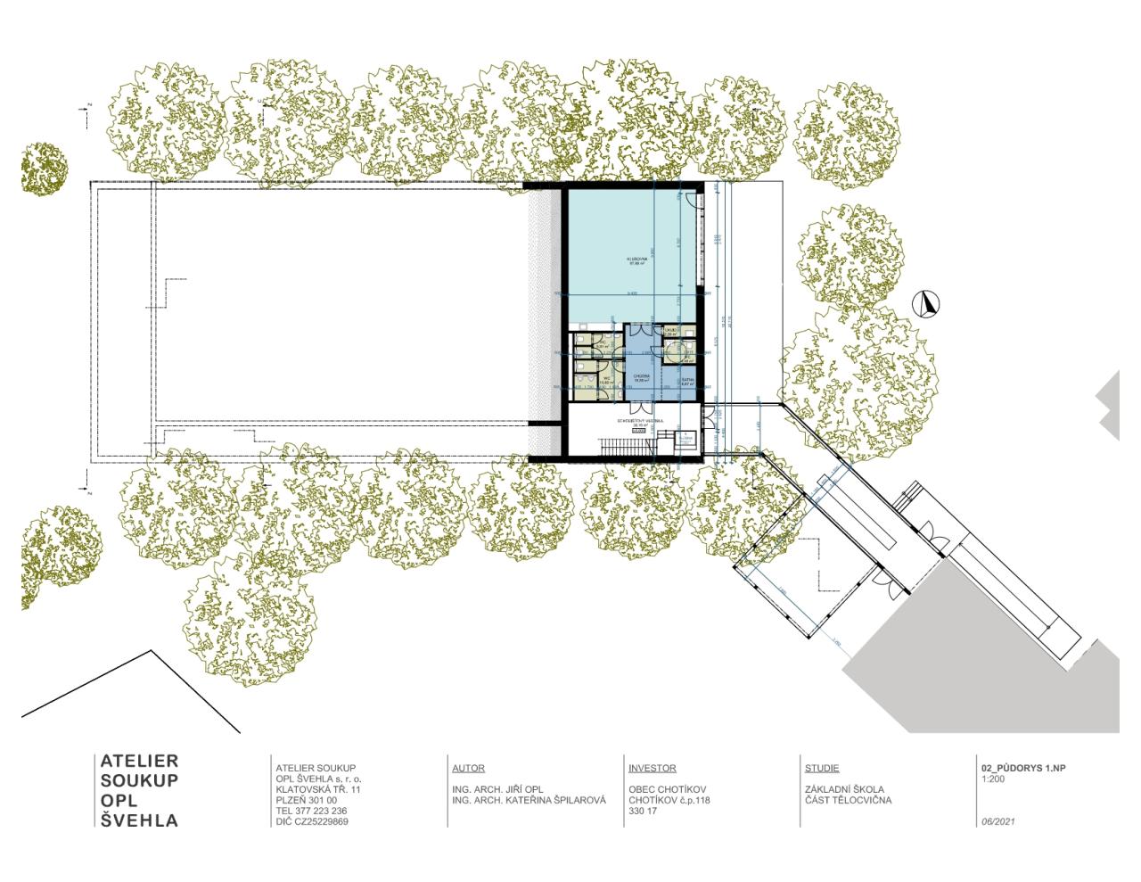 Celková koncepce nové tělocvičny respektuje polohu stávajícího objektu základní školy a